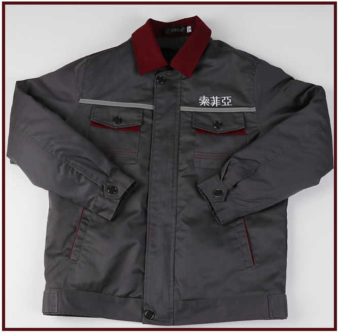 天曼服飾經典夾克款冬季棉服工作服,采用深灰色65/35滌棉面料,耐磨耐穿,220克優質絲綿內膽,長效保暖,活里活面,便于清洗,棗紅色衣領與口袋處的撞色設計,既中和了深灰色給人的沉悶感,也讓人感受到這冬日里尚存的一絲溫暖。
