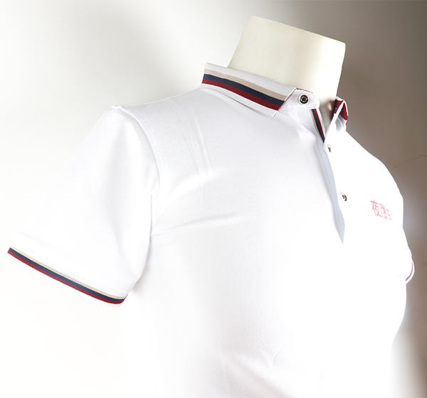 這款工作服主色調(diào)采用白色,在透氣、吸汗上有一定優(yōu)勢,因夜鷹車燈工作人員普遍為男性,所以選擇了T恤的款式,領(lǐng)口和袖口使用藍(lán)紅灰色條紋,簡約而不失時尚感,扣子使用子母扣,美觀不易脫落,