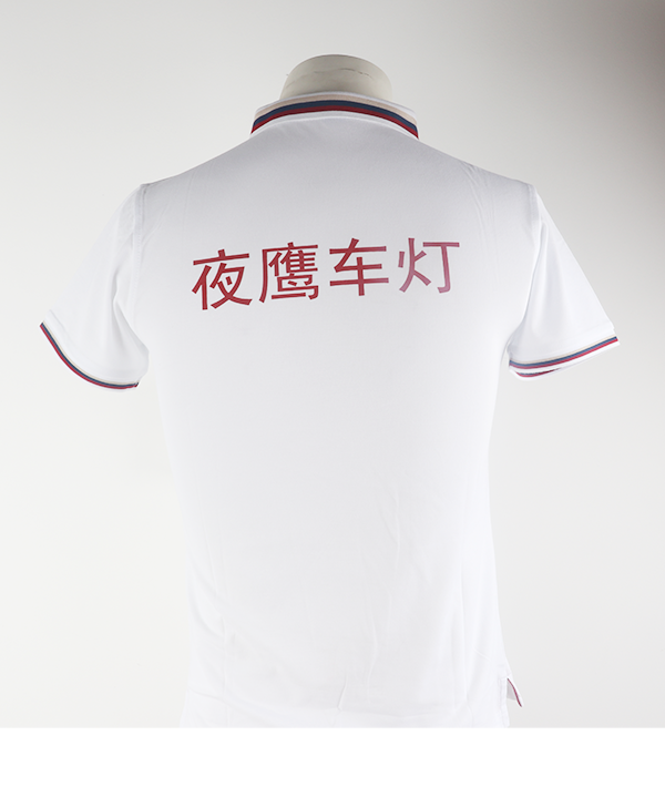 同時在胸前和后背印制紅色logo:夜鷹車燈,提高了企業(yè)的識別度,logo大小位置顏色經(jīng)過了幾次修改調(diào)整,不會顯的突兀同時又能完美體現(xiàn)企業(yè)標(biāo)識。