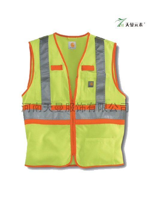 面料:100% 滌;塑脂拉鏈;一條5CM 反光條環(huán)繞馬夾前后一周,并且在雙肩還各有一條反光條。