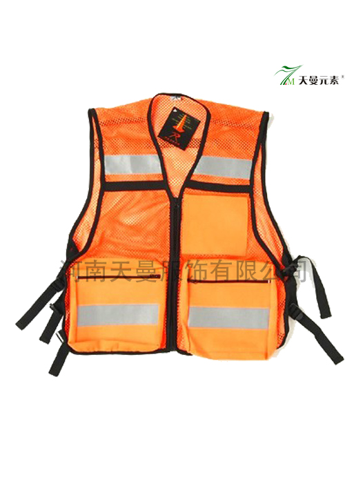 100% pure polyester, ingredients is the orange mesh fabric, reflective strip on the chest, hem pocket with two reflective strips, have two nylon zipper pocket, black cloth on the side of the edge of vest.